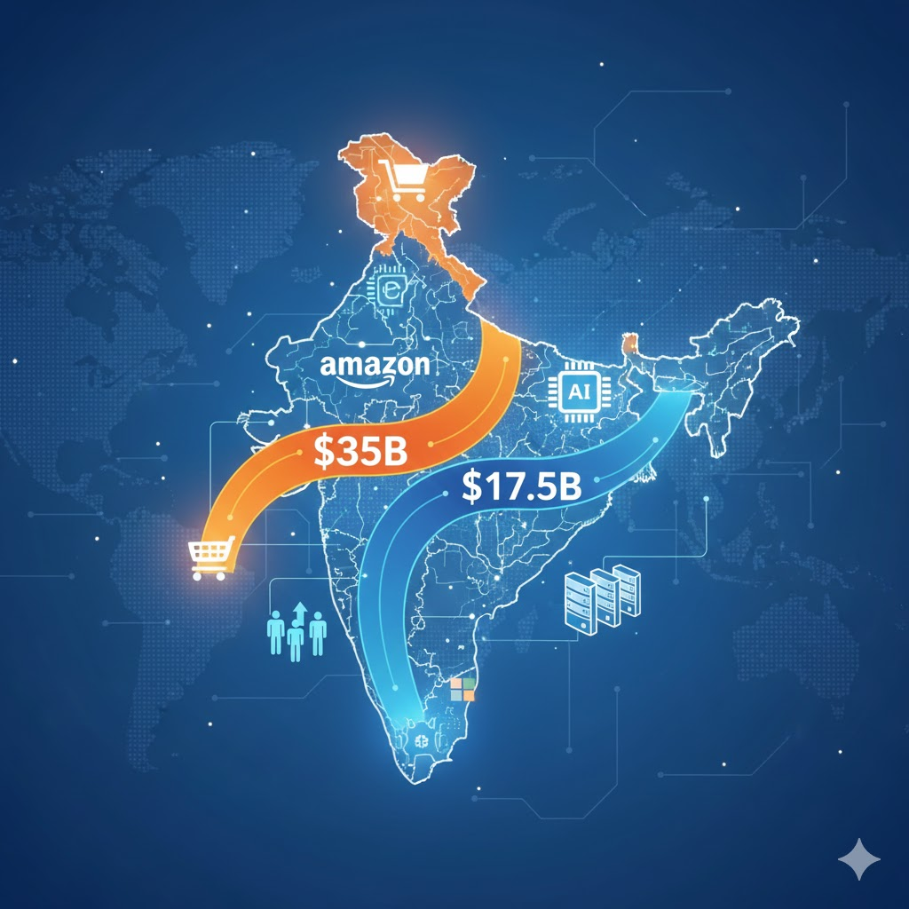 Amazon anunciou US$ 35 bi em 5 anos, focando em IA e exportações; Microsoft planeja gastar US$ 17,5 bi em 4 anos, somando-se a compromissos anteriores, em uma clara corrida pelo mercado indiano.