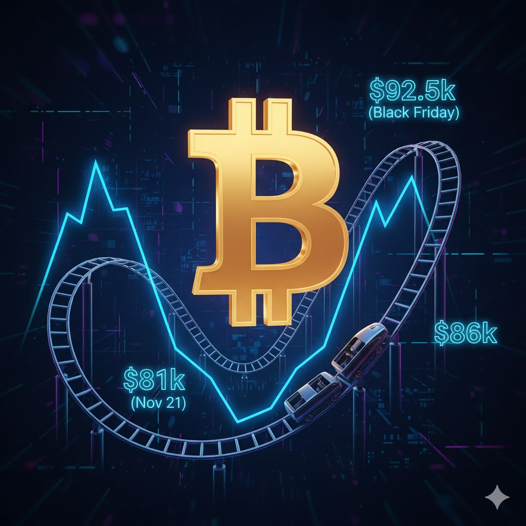 Criptomoeda atinge pico acima de US$ 92,5 mil na sexta-feira de promoções, mas começa a ser vendida no domingo, estabilizando perto de US$ 86 mil e demonstrando sua instabilidade característica.