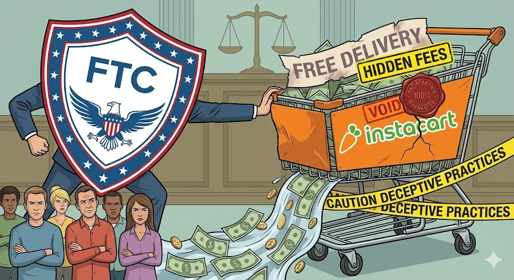 A Instacart foi ordenada a pagar US$ 60 milhões em reembolsos a clientes para encerrar alegações da Comissão Federal de Comércio (FTC) de que usou práticas enganosas para aumentar custos. A FTC alegou que a plataforma de entrega de mercadorias anunciou falsamente entrega grátis e garantia de 100% de satisfação, e também não divulgou adequadamente os termos de sua assinatura Instacart+. A comissão afirmou que os consumidores ainda eram cobrados por uma taxa de serviço nas entregas e que a garantia de satisfação da Instacart implicava um reembolso a clientes insatisfeitos, o que a empresa não fazia. A Instacart nega as alegações.