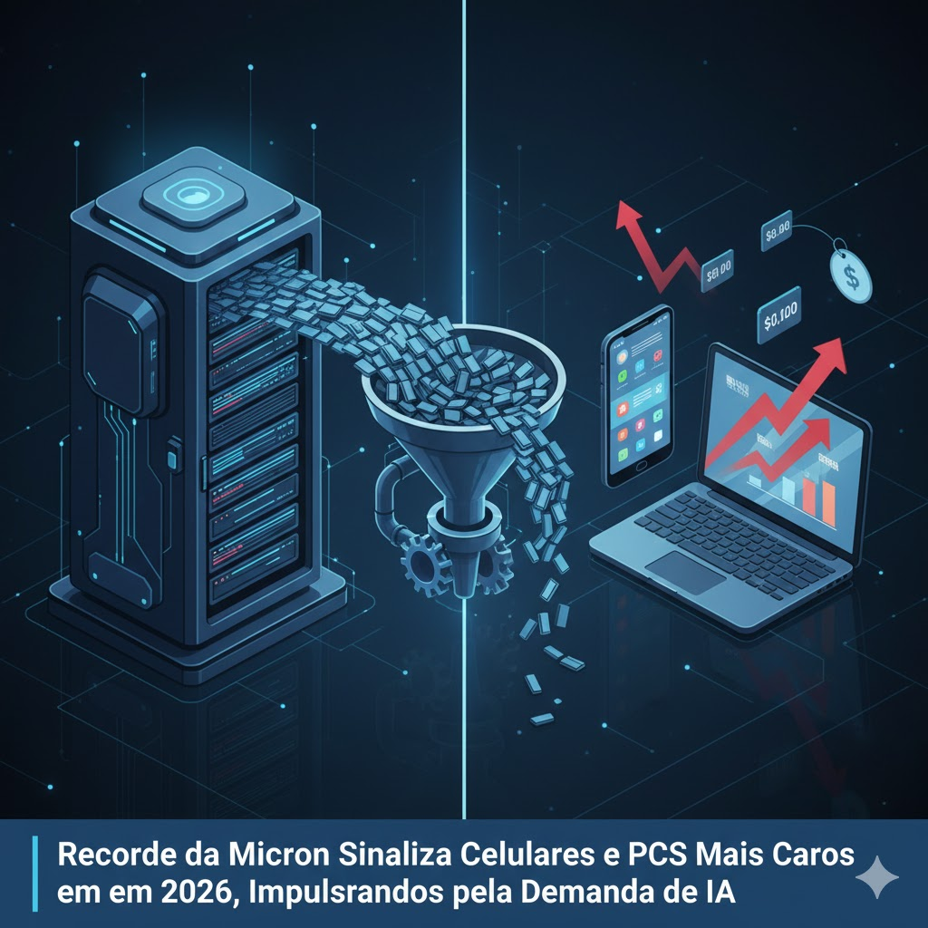 O recorde de receita e lucro da Micron Technology, impulsionado pela demanda insaciável por chips de memória especializados para sistemas de IA, traz uma má notícia para consumidores: celulares e PCs devem ficar mais caros em 2026. A capacidade de produção das fábricas está sendo direcionada para atender a memória de alto valor para data centers de IA, deixando menos oferta para os chips que vão em dispositivos eletrônicos do dia a dia. Especialistas alertam que os fabricantes de eletrônicos, como Dell e HP, que já estão pagando mais pelos componentes, terão que repassar parte desse custo aos preços finais. Além disso, produtos com menos memória podem se tornar mais comuns. A situação pode desacelerar as vendas, especialmente considerando que os ciclos de atualização de dispositivos já estão mais longos, embora o fim da vida útil de uma versão importante do Windows possa manter a demanda corporativa por PCs.
